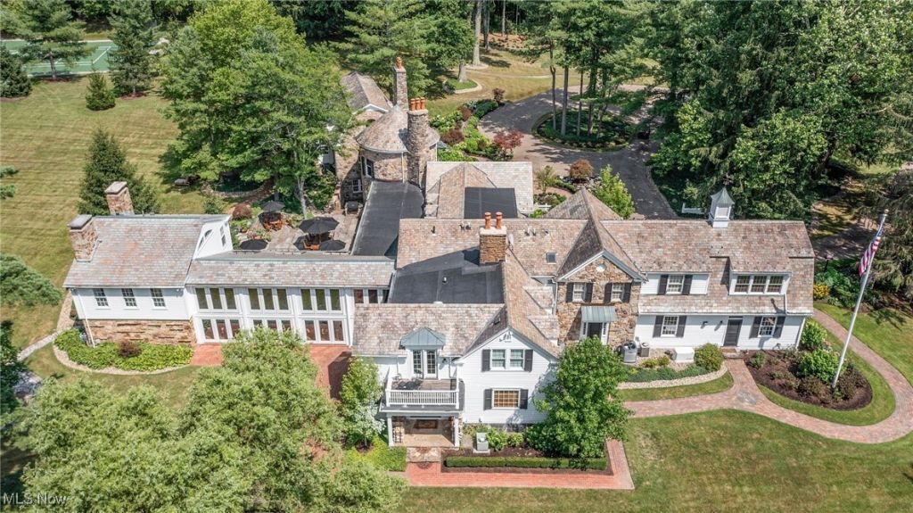 Set on 24 scenic acres of sweeping lawns & woodlands with 3 stocked fishponds, this magnificent English country estate, reimagined by renowned Cleveland architect Anthony Paskevich, offers an unparalleled living experience. A long, illuminated drive winds past original farmhouse & barn complex, leading through a tree-lined allée flanked by stunning gardens to the impressive main residence. A turreted entrance welcomes guests. The stone & clapboard exterior gives way to magnificent millwork, vaulted ceilings, arched doorways, oversized windows, and carefully selected stone & wood flooring. Designed for everyday living and grand entertaining, the generously sized gathering areas incl. a great room, formal dining room, family room, and solarium, all with fireplaces. A tranquil haven, the primary bedroom suite has dual baths and 4 additional suites incl. private baths. Enclosed by walls of glass, a spectacular pool pavilion opens to a stone patio overlooking breathtaking scenery and the exercise room, incl. sauna and steam room, epitomizes luxury & relaxation with a view. Approached by a brick courtyard, the custom-built, 1-bedroom guesthouse has an expansive brick terrace with geothermal heat, a fireplace and outdoor kitchen & pizza oven. With the richness & warmth of stone, brick, and wood, the bar room on the walk-out lower level exudes the charm of a traditional Scottish pub. The 2-car garage has an additional 1-bedroom, 1-bath guest suite on its upper level. Original farmhouse and one-room schoolhouse, moved to the property in the 1930s, are fully updated with modern amenities. The farmhouse has 3 bedrooms, 1.5 baths, wraparound porch, A/C and whole-house generator. The estate also has a fully restored, authentic barn complex - 4 frame buildings connected by a covered walkway: barn with 4 stalls & hayloft, greenhouse/studio, and detached 2-car and 4-car garages. Open fenced pastures with loafing sheds have ample space for horses, alpacas, or sheep to graze freely.