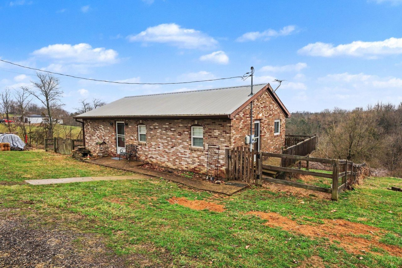Enjoy peaceful country living with this charming all-brick two-bedroom, two full bath home set on 3+ scenic acres. A durable metal roof and updated wood flooring throughout provide both style and long-lasting quality.The home features an open concept living, dining, and kitchen area filled with natural light and beautiful views of the surrounding land. Sliding glass doors from the living room lead to a spacious rear deck, the perfect place to relax and enjoy the quiet countryside. The primary bedroom offers direct access to the deck through sliding doors, creating a private retreat to enjoy morning coffee or evening sunsets. The primary bathroom includes a relaxing soaker tub and a large walk-in closet for ample storage. A separate laundry room provides convenience and leads to a side deck entrance. Outside, the property truly shines with over 3 acres of open scenery, a fenced area ideal for dogs, and a barn with stalls ready for animals, making this a fantastic opportunity for those looking for a small hobby farm or simply more space to enjoy country living. A must see!